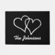 Black and white door mat with interlocking hearts and family name. Make your own custom indoor / outdoor doormat with custom background colour and saying. Add your own welcome message, family name, monogram, surname or funny quote. Cute gift idea for new home / housewarming, wedding venue, dorm, store, shop, office etc. Trendy script typography with interlocked love symbol. Romantic theme. Personalizable template. Create your own entry mat / rug for front door / entryway or hall. Customisable home decor / decorations for your cosy house. Cute present for newlyweds couple, bride and groom, husband and wife.