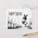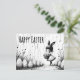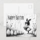 A stylish black and white illustration featuring a cute girl with bunny ears holding a basket of Easter eggs. The minimalist and slightly whimsical scene blends artistic charm with a modern Easter aesthetic.