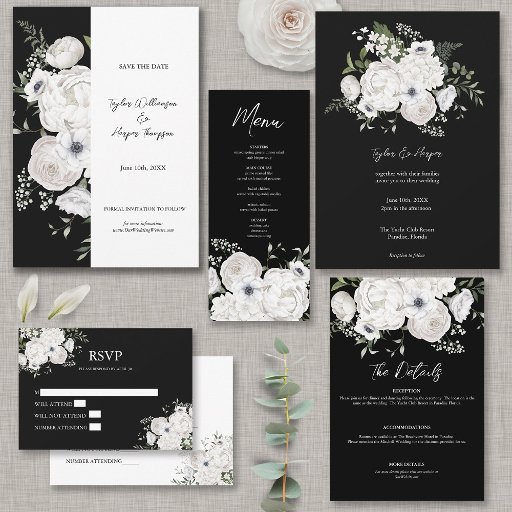Our wedding invitation suite is perfect for couples who want an elegant, black and white wedding. Our suite includes an elegant black and white, floral bouquet with white roses, greenery, and ferns. This is a perfect suite for a day or night wedding.