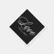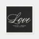 Customisable paper napkin featuring black and white whimsical script. This "love" napkin is perfect for weddings.