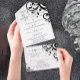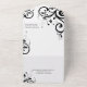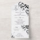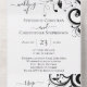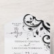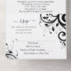 Unique all-in-one invitation with tear-off rsvp card. Festive and fanciful black and white swirl wedding invitations. Decorative swirls with leaves and roses, and beautiful fonts with swirl ligatures. Simple, modern and classic clean wedding invitation, with your custom wedding details.