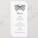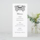 A wedding or party menu design to match the Halloween floral tattoo range. This monochrome design features two bands of an illustrated floral pattern of roses, webs, spiders and bats and plenty of space for your order of service in the middle in a mix of elegant black fonts on a white background. This would be perfect for a Halloween or Gothic themed wedding or as part of a Halloween party.