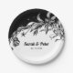 Vintage black white flowers and typography wedding paper plate. It showcases a vintage black white floral border and your text in modern typography.
