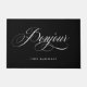 This French modern and elegant doormat says "bonjour" in swirly, white script calligraphy on a black background, and has a spot for your family name.