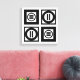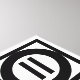 Bold geometric pattern features four black squares with white space between them. The two diagonally opposed thick squares each contain a thin black circle with a thick equal sign inside. In contrast, the two thin squares each contain a thick black circle that touches the square’s edges with a thin vertical equal sign inside.