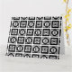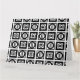 Bold geometric pattern features four black squares with white space between them. The two diagonally opposed thick squares each contain a thin black circle with a thick equal sign inside. In contrast, the two thin squares each contain a thick black circle that touches the square’s edges with a thin vertical equal sign inside.