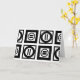 Bold geometric pattern features four black squares with white space between them. The two diagonally opposed thick squares each contain a thin black circle with a thick equal sign inside. In contrast, the two thin squares each contain a thick black circle that touches the square’s edges with a thin vertical equal sign inside.