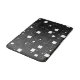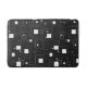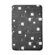This image features a modern, abstract geometric pattern in black and white. It consists of various-sized squares and rectangles arranged randomly across a black background. Some shapes are solid white, while others are outlined, creating a layered effect. Small dots and pixel-like elements are scattered throughout, adding depth and texture. The overall design is minimalistic and conveys a digital or futuristic aesthetic.