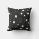 This image features a modern, abstract geometric pattern in black and white. It consists of various-sized squares and rectangles arranged randomly across a black background. Some shapes are solid white, while others are outlined, creating a layered effect. Small dots and pixel-like elements are scattered throughout, adding depth and texture. The overall design is minimalistic and conveys a digital or futuristic aesthetic.