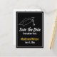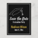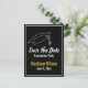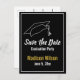''Save the Date' for a graduation party with this black, white and faux gold postcard. Customise with graduate's name in script and party date. A graduate's cap is at the top above the text on a black background.
