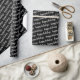 Modern gift wrap set features black with white script "Happy Holidays" text as a diagonal pattern.