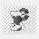 Destei's original cartoon illustration of a cute black and white coat colour Bichon Havanais / Havanese breed dog. The background has a pattern of grey dog paw prints.
