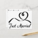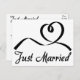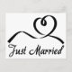 This fun wedding postcard features a hand drawn black swirly heart highlighted against a crisp white background with a Just Married announcement printed in a bold black script font.