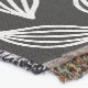 This throw blanket has a black background and white leaves. Graceful white leaves curve across the surface. his design speaks to lovers of earthy boho aesthetics, boutique-style decorators, and anyone curating a cosy, nature-inspired home. Perfect for those who appreciate understated elegance with a poetic twist.