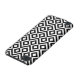 This stylish black and white geometric pattern is an original ornamental design. White meanders angle around black diamonds containing white diamonds. Black zigzags provide subtle separation between the winding paths.