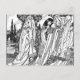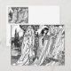 decorative vintage black and white drawing of ladies of the middle ages in beautiful long gowns and cloaks with decorative patterns with flowers, long hair in plaits socialising together in a garden with cypress trees and flower bushes as one lady with long hair and long flowing dress carries a bunch of garden roses in her hand, a fine art drawing for lovers of classical style art with a group of girls of mediaeval times