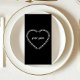 This is a Black and White Minimalistic Gothic Wedding Place Card. Featuring a dark design with a Spine Heart form on the front, and a skeleton with a wine glass on the back. Vintage Public Domain elements.