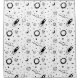 A monochromatic, black and white simple, minimalist design for a shower curtain. Illustrated with subtle brush strokes with stars, planets, the sun, moon, a rocket ship, and UFO detail. A fun design for a child's bathroom.