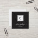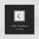 Chic and professional black and white square business card design features a modern square element holding your single initial monogram, with your name and title or business name beneath in contemporary lowercase serif lettering. Personalise the reverse side with your contact details in matching black. A modern choice for any occupation; sample shown for realtors or real estate agents.