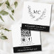 Black and White Monogram Wreath with Slogan Square Business Card... The front of our black and white square business card features an elegant botanical wreath bordering your two monogram initials in classic black ink on a white background. Your name and title (or company name) appear in white ink on a black rectangle bordering the bottom of the business card, giving an authoritative structure to balance the delicate leafy wreath. On back of the card is your social media contact info, website address and QR code linking to additional information. The black section on the bottom contains your business motto or tagline. Example text currently shows "My motto is" followed by "Always take the high road" in white script typography. All text and the QR code can be easily revised on the personalisation template.
