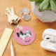 Destei's original cartoon illustration of a black and white coat colour Papillon breed dog on a pink background colour with a pattern of hearts in different sizes. There is also a personalizable text area for a name.
