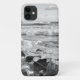 This phone case features a beautiful black and white photo of a very wavy Atlantic Ocean shore.