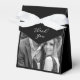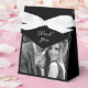 These black thank you favour boxes feature a classic black and white photo of the happy couple and thank you in elegant white script. To edit the text on both sides and change the photo click on the personalise button.