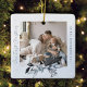 Mark a meaningful moment with this elegant square ornament featuring your custom photo framed by a soft frosty background and delicate black and white pine leaves. The vertical script on either side—“Our First Christmas” and your family name—adds a modern twist to a timeless keepsake, blending modern minimalist colourful typography with seasonal vintage Christmas non photo charm.
