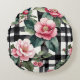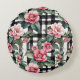 Black and White Plaid With Leafy Pink Camellias Round Cushion