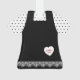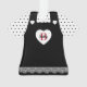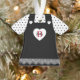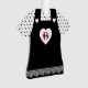 Black and white polka dot dress with matching black pinafore, features heart buttons, lace trim, and a large heart design in front, showcasing your loved one's monogram and name. On the back is a small heart "tattoo" in white, with the wording, "Christmas 20xx" in red. Personalise with your details and the current year.