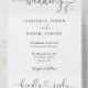 All in one black and white wedding invitation featuring elegant hearts script typography and monogram initials. The invitation includes a perforated RSVP card with your personalised wedding QR code. Designed by Thisisnotme©