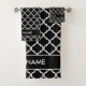 Black and white quatrefoil pattern personalised Bath Towel Set. Classy moroccan trellis print design. Elegant home decor for stylish bathroom, toilet, guest house, cabin, vacation home etc. Custom background colour. Includes little washcloth, small hand towel and big bath towel. Stylish present idea for friends, family, couple, newlyweds etc. Add your own custom name, quote or monogram.