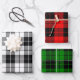 A wrapping paper sheet set with a plaid pattern in black on three background colours, white, red and green. Customise the background colours, pattern sizes among other options.