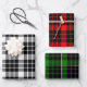 A wrapping paper sheet set with a plaid pattern in black on three background colours, white, red and green. Customise the background colours, pattern sizes among other options.