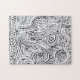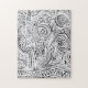Jigsaw Puzzle printed with Black And White Scratch And Dot Art By TheFabricSeal at Zazzle is a whimsical and wonky black and white artwork design created with scratch art and dot art techniques making many lines and shapes with a few flowers and stars into the busy image.