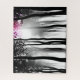 Silhouettes of majestic trees stand tall in hues of black and white, emanating a sense of mystique. Amidst this monochromatic forest, an unexpected burst of vibrant purple splashes adds an enchanting touch.