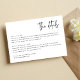 Keep your wedding details organised and elegantly presented with the Black and White Simple Modern Minimalist Wedding Enclosure Card, designed for couples who value clarity and refined style. Featuring a clean black text layout on a crisp white background, this enclosure card perfectly complements any modern, classic, or minimalist wedding theme. Ideal for sharing essential information like directions, accommodations, or reception details, it maintains a cohesive look with your stationery suite while ensuring guests have everything they need. Customisable and printed on premium-quality cardstock, this enclosure card adds a thoughtful and stylish touch to your wedding planning experience.