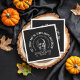 Custom printed Halloween party paper napkins to match our Vintage Skull collection. Personalise it with your family name, party details or other custom text around a distressed vintage skull illustration and scroll ornament on a black background. Use the design tools to edit the text fonts and colours and add your own photos and text to create your own unique Halloween party decor.