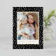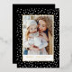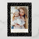 Modern holiday card featuring your vertical photo on the front framed in gold foil with a background of black and white snowballs. Personalise the front of the card with your custom greeting and family name in bold gold foil lettering. The foil Christmas card reverses to display an additional photo with your custom message displayed below.