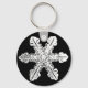 This black and white snowflake keychain features a photograph of a snowflake taken by Wilson Bentley in 1902. This image was edited slightly from the original image, which is in the public domain.