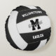 This sporty team colours volleyball round throw pillow features the image of a realistic looking black and white volleyball upon which you can customise the player's name, monogram or varsity letter, team and mascot name on the front and jersey number on the back - by katz_d_zynes
