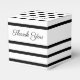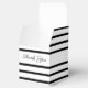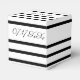 Designer wedding favour guest box in a bold black and white stripe print, the colours can be changed to any colour to coordinate with your special event theme. Text on front, back, and top can be personalised to any message.