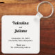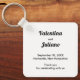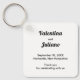 A square keychain as a favour with black text on white background for couples seeking a classic and timeless colour combination that can complement various wedding themes. It is also suitable for couples who prefer a text based design without background elements for readability. The black text contrasting on the white background also improves readability. The text is centre aligned and the fonts used are script and sans serif. Script font is used to enhance the design while the sans serif font is used to enhance readability. Customise it by typing the names of the bride and groom, date and location of the wedding. You can also change the wording in the design tool including the font style, font colour and background colour. Please check the appearance of the front and back sides after typing text. If the appearance is pleasing to you, you can place your order now. If you need to resize or reposition the text, please adjust in the design tool. keychain as a favour to express appreciation to the presence of the guests. To the bride and groom, congratulations on your engagement! Wishing you both a lifetime filled with love and happiness.