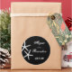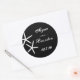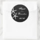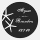 Black and white beach wedding stickers. White pencil starfish on a black background. Modern script text is in white. Easily add the names of the bride and groom and wedding date. Choose from two sizes and add to invitation envelopes or use to decorate favours for the reception.