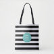 Personalise this chic black and white striped tote bag with your single initial monogram on a summery turquoise aqua circle badge for a tote that's uniquely yours! Makes a great gift for bridesmaids as well.