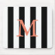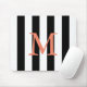 Black and white striped monogrammed mouse pad. Coral text. Customisable.