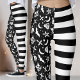 These striking Gothic Occult Pattern Halloween witch leggings feature a bold black and white striped left leg paired with a right leg covered in a mystical pattern of planchettes, cat faces, stars, moons, potion bottles, crosses, bats, and pentagrams. The unique combination makes them a perfect choice for spooky season outfits, witchy costumes, or everyday gothic fashion.