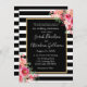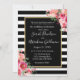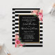 This stunning and striking Jewish wedding invitation features bold black and white stripes with a gold trim and pink and blush and fuschia flowers. The flowers and roses really pop out and sing beautifully on this gorgeous wedding invitation.