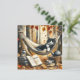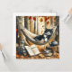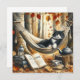 This cool animal graphic shows a black and white tuxedo cat sleeping in a hammock and dreaming of adventure. Next to this adorable kitty is an open book and in the background there are autumn forest trees.
