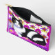 Pouch in an illustration of a black and white tuxedo cat on a cushion, with an exotic, patterned background in shades of magenta and purple